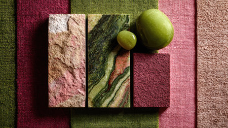 A stunning composition featuring natural stones and textiles in various colors and textures. Perfect for design inspiration and decorative purposes.