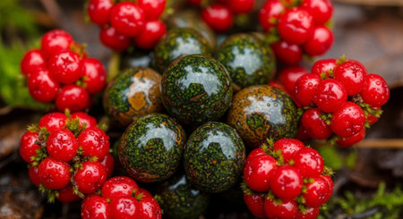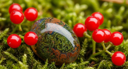 A vibrant marble sphere rests on a textured surface, featuring rich hues of green and orange. Soft lighting enhances the intricate patterns and details, creating an inviting visual appeal.
