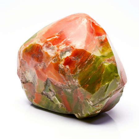 a rock with red and orange stripes is placed on a white background. the rock is styled with light red and light green colors, resembling the artistic influences of jessie arms botke. the richly colored rock exhibits shades of erudite, dark pink, light amber, and light emerald, creating a visually captivating daguerreian composition. ai generated