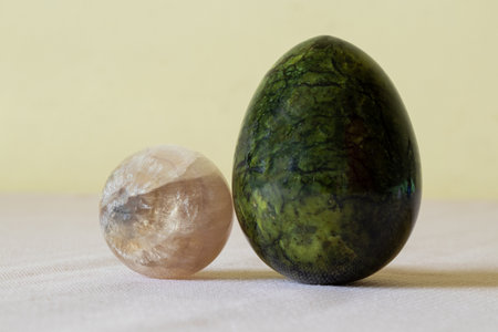 Moonstone, quartz and emerald jasper in the form of an egg on a table on a yellow background, gemstones, collection