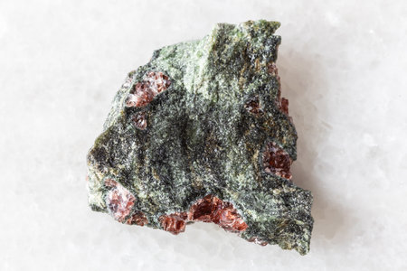 sample of pyrope garnets in raw rock on white marble background close up from Norway