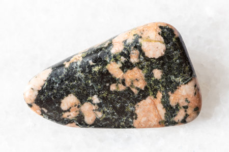 Unakite (granite with green epidote) processed in the form of a cabochon on a white marble background