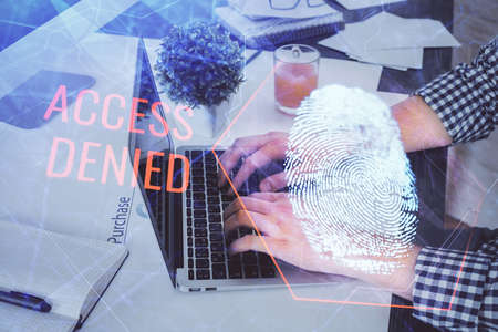 Double exposure of man's hands typing over computer keyboard and finger print hologram drawing. Top view. Personal security concept.