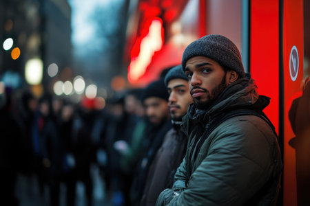 Young men stand in line on a busy city street at twilight, dressed in warm jackets and knit hats. The background features a red neon sign and a crowd waiting in anticipation, creating a lively urban atmosphere.