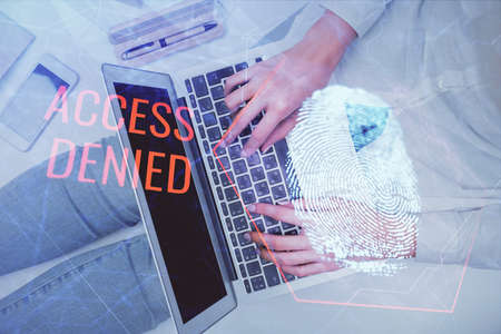 Double exposure of woman hands working on computer and fingerprint hologram drawing. Top View. Digital Security concept.