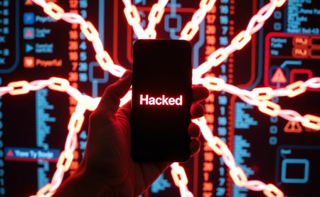 A hand holds a smartphone displaying HACKED with binary code and warning signs in the background, illustrating mobile security threats.