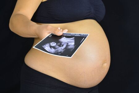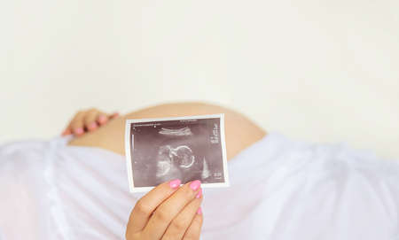 Pregnant woman holds her baby ultrasound photo on her belly. Mother is holding sonogram picture of baby on her belly close-up.