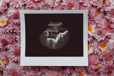 Photo of ultrasound examination of a child during pregnancy of the mother in the second and third trimester close-up against the background of pink chrysanthemum flowers, the concept of waiting