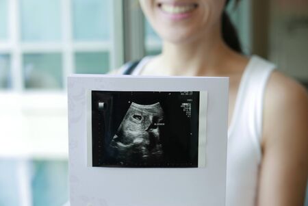 Ultrasound image pregnant baby photo. Woman holding ultrasound pregnancy picture. Pregnancy, medicine, pharmaceuticals, health care and people concept