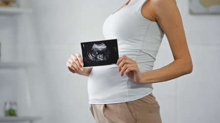 Cropped view of pregnant woman holding ultrasound scan of baby near belly