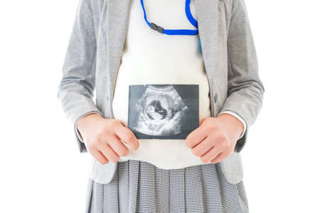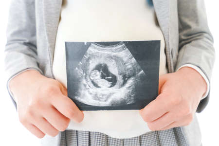 A shot of mother holding unborn baby sonography image on a white background