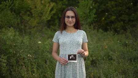 A young pregnant woman holds an ultrasound picture of a baby in her hands. Girl in glasses and a dress in nature.