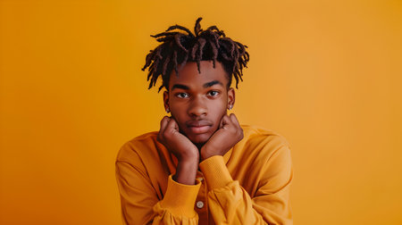 Portrait of a fashionable young male with dreadlocks in casual clothes against a vibrant yellow backdrop. A.I.