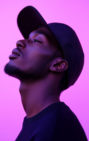 African man portrait in studio on colorful background - Cool black young male with stylish attire posing, creative colored lighting