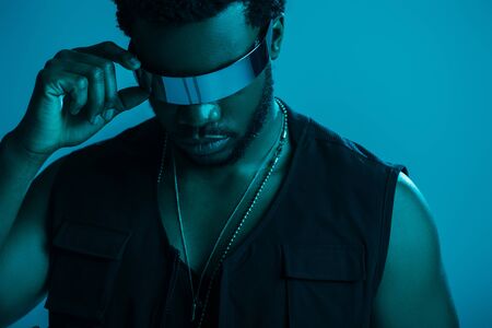 stylish african american man in futuristic sunglasses posing isolated on blue in blue light
