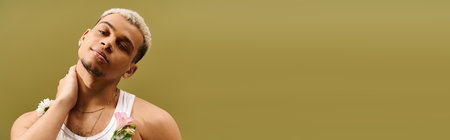 Handsome young man poses confidently in tank top, adorned with flowers, in a stylish studio space, banner
