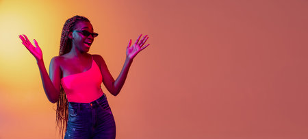 African young womans portrait on dark studio background in neon. Concept of human emotions, facial expression, youth, sales, ad.