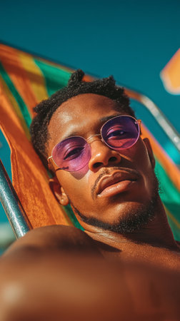 A young man enjoys a leisurely moment while lounging on a vibrant beach chair. He is wearing stylish sunglasses and soaking in the warm summer sun.