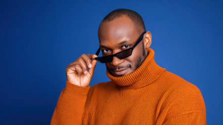 A man with a confident smile adjusts his sunglasses while wearing a cozy orange sweater. The background is a solid blue, highlighting his relaxed demeanor and stylish look.