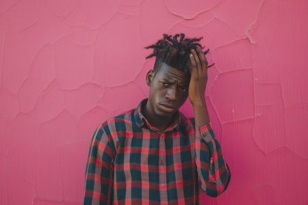Young tired African American man holding head suffering from headache on early morning against pink kinfolk wall background