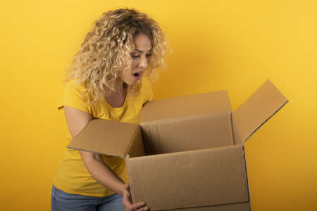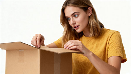 Woman opens a sealed cardboard box with a curious expression while wearing a yellow shirt in a studio setting. Clean white background offers ample copyspace and available space for text or graphic overlays for layouts