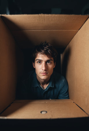 An unusual view from within a cardboard box unveils the sight of cascading hair and edge of face peeking into the box, creating a sense of hidden finds and encapsulating curiosity.