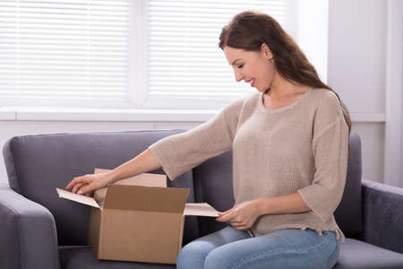 Smiling Young Woman Sitting On Sofa Unpacking Received Parcel