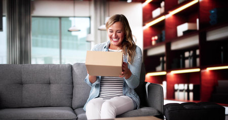 Woman Receiving Parcel Or Delivery Package. Opening Gift