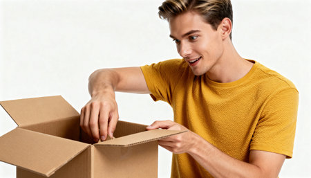 Man opens a cardboard box with a curious, excited expression while wearing a yellow shirt against a clean white background, providing ample empty space for text or design placement in the composition