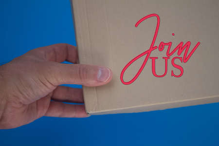 Join Us word with cardboard box. Brown folded cardbox.
