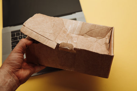 Spoiled paper box in a hand. Online shopping and delivery concept. Shipment accident