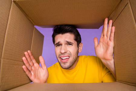 Portrait of young unhappy negative mood male receive bad broker stuff delivered isolated on violet color background