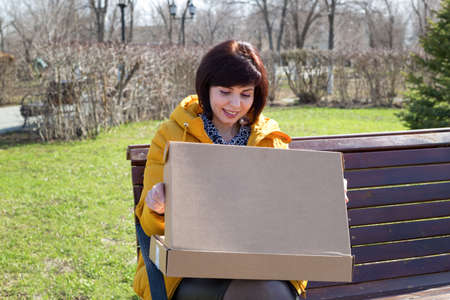 A happy woman with a smile opens a box with a new laptop on the street.
