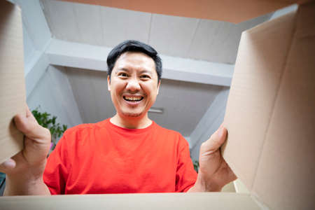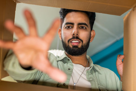 View from inside the box. Happy Indian man unpacking delivery parcel at home. Smiling satisfied guy shopper, online shop customer opening cardboard box receiving purchase gift by fast postal shipping