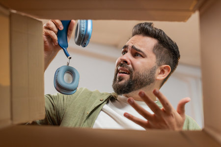 Dissatisfied annoyed male customer open cardboard box receive damaged broken wireless headphones, shocked young man consumer having problem complaint frustrated with bad order delivery at home room.