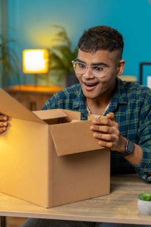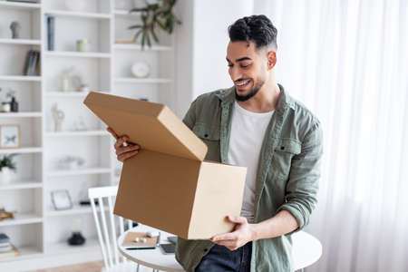 Excited young arab man opening delivery box at home and looking inside