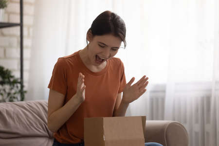 Excited millennial girl open cardboard box triumph with good quality product shopping online, overjoyed young Caucasian woman unpack unbox carton post package with order, delivery service concept