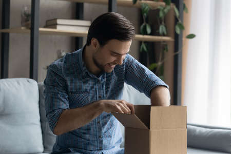 Man sit on sofa in living room opens delivered parcel cardboard box feels glad satisfied due good quality of goods, easy quick delivery services. Trusted transport company, satisfied client of e-store
