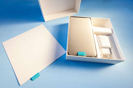 open box with new smart phone on blue background