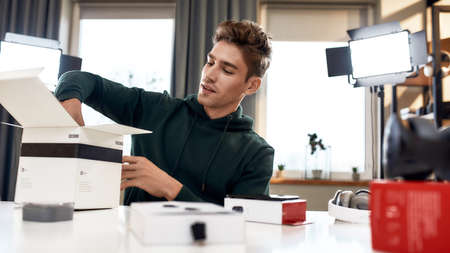 Time for Unpacking. Young male technology blogger recording video blog or vlog about new camera lens and other gadgets at home studio. Blogging, Work from Home concept