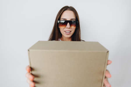 A portrait of a girl in dark glasses in close-up on a white background, a cardboard box in the foreground. The concept of advertising delivery, mail.