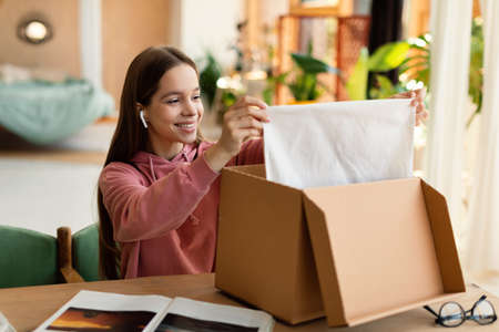 Happy customer. Happy teen girl opening and unpacking parcel cardboard box, sitting at table at home and smiling