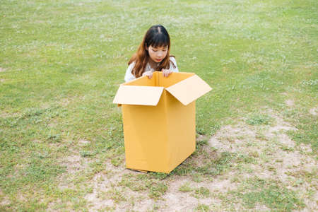 Young asian thai woman hipster curly hairstyle on white shirt looking inside the box.