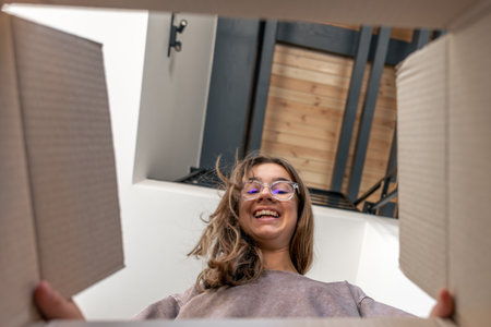 Teen girl looking into box, joy of moving day. Happy unboxing.