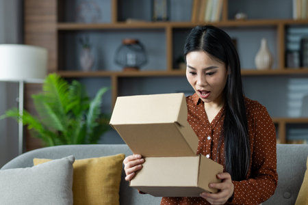 Asian woman with long hair experiencing surprise while unboxing cardboard box on sofa at home. Captures excitement, discovery, and unexpected moments in personal space.