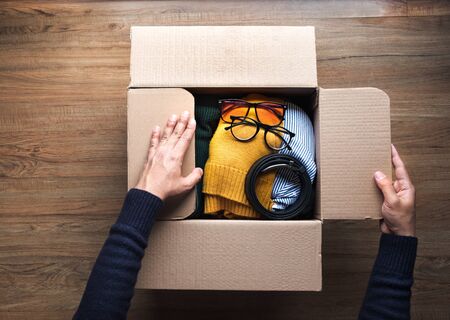 Donation concepts with young person packing accessories clothing in brown box.giving and sharing with human.second hand or recycle product ideas