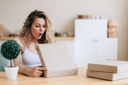 Emotional woman unpacking parcel at home. Online store