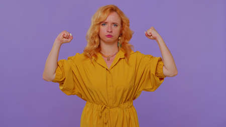 I am strong and independent. Long haired lovely girl showing biceps and looking confident, feeling power strength to fight for rights, energy to gain success win. Young woman on purple wall background