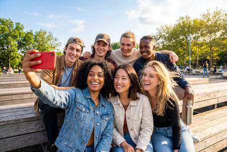 A multiethnic group of seven cheerful young men and women sit together on wooden benches in a sunny park while laughing and taking a selfie with a red smartphone held by a woman in front.