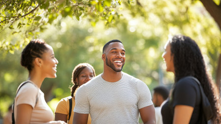 A group of four friends stands under green trees in a park, happily conversing and enjoying each others company on a bright day. They share smiles and laughter, creating a joyful atmosphere.